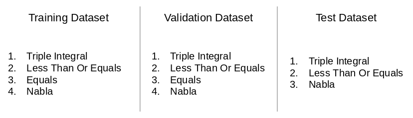 Note that since the test dataset doesn’t have the “Equals” class, it assigns Nabla the number 3, instead of 4. This will cause all sorts of pain later on. For this reason, I had to ensure that each symbol was in all three sets. I found this out the hard way, and ended up having to read through the source code of PyTorch’s image dataset.