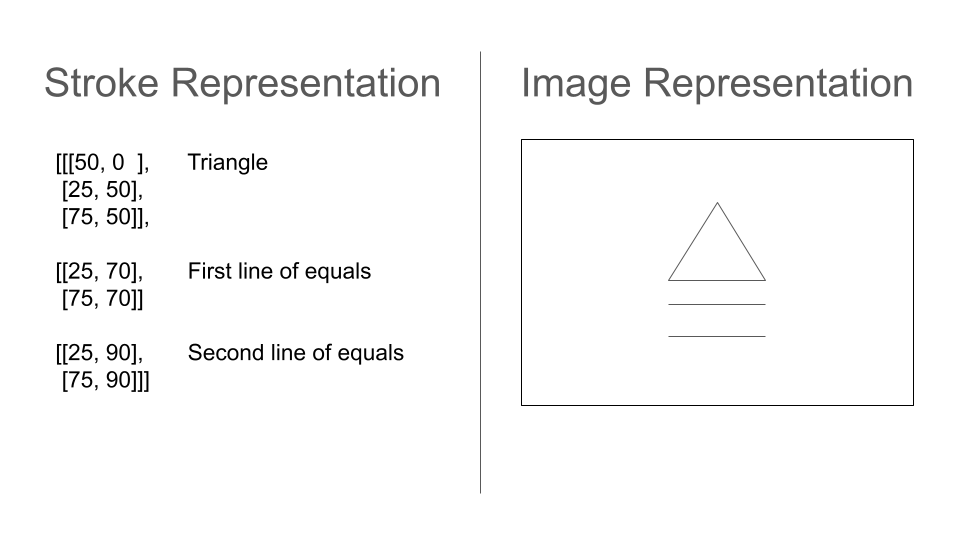 The dataset I’ll be using uses the stroke information, but I will be transforming it into image representation. Although this loses information about the order in which strokes were drawn, I expect this may be more robust, as different people might draw symbols in lots of different ways.